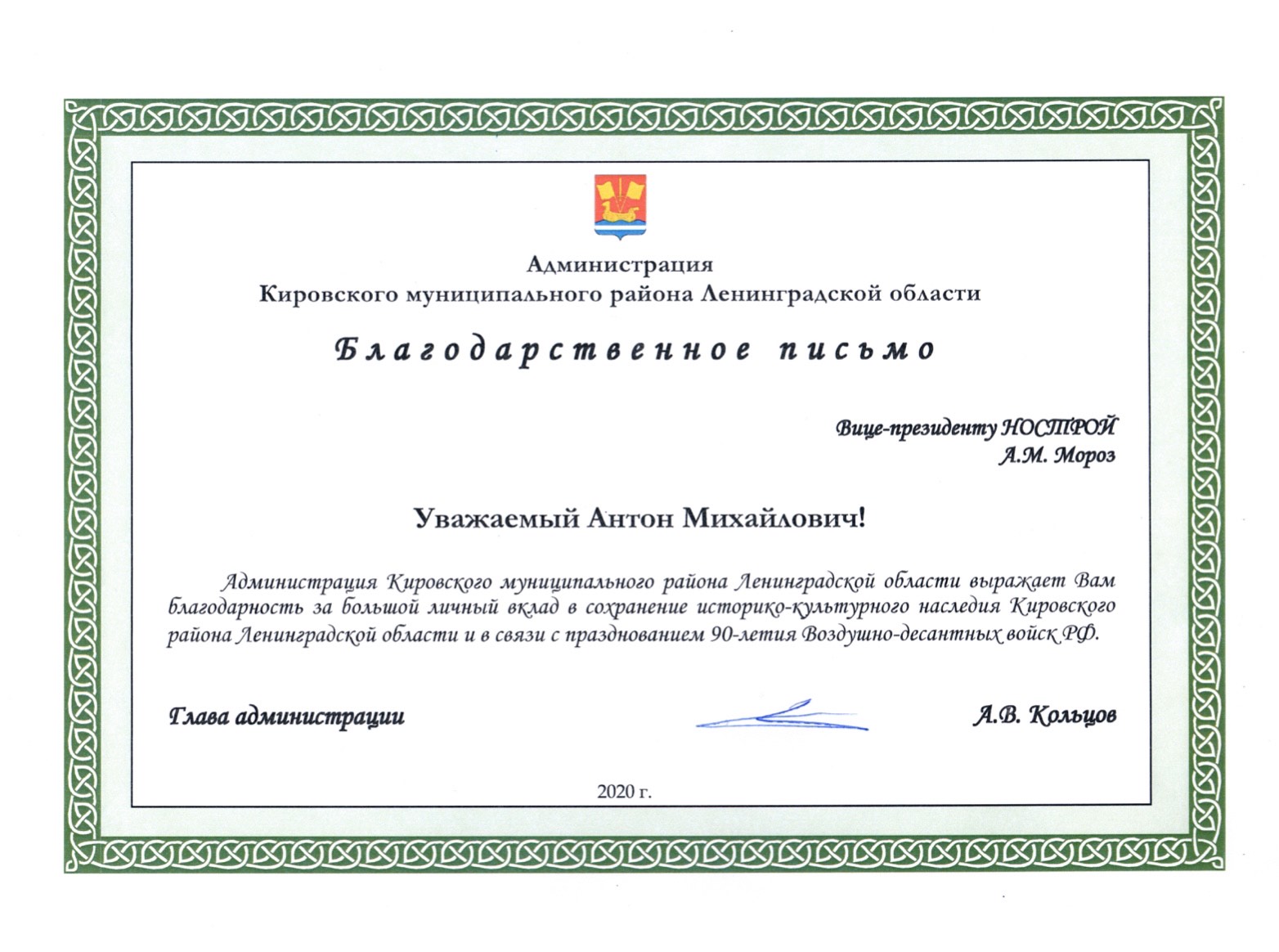 Глава Администрации Кировского муниципального района Ленинградской области Алексей Кольцов выразил благодарность вице-президенту СПб ТПП, вице-президенту НОСТРОЙ Антону Морозу за большой личный вклад в сохранение историко-культурного наследия района в связи с празднованием 90-летия Воздушно-десантных войск РФ.